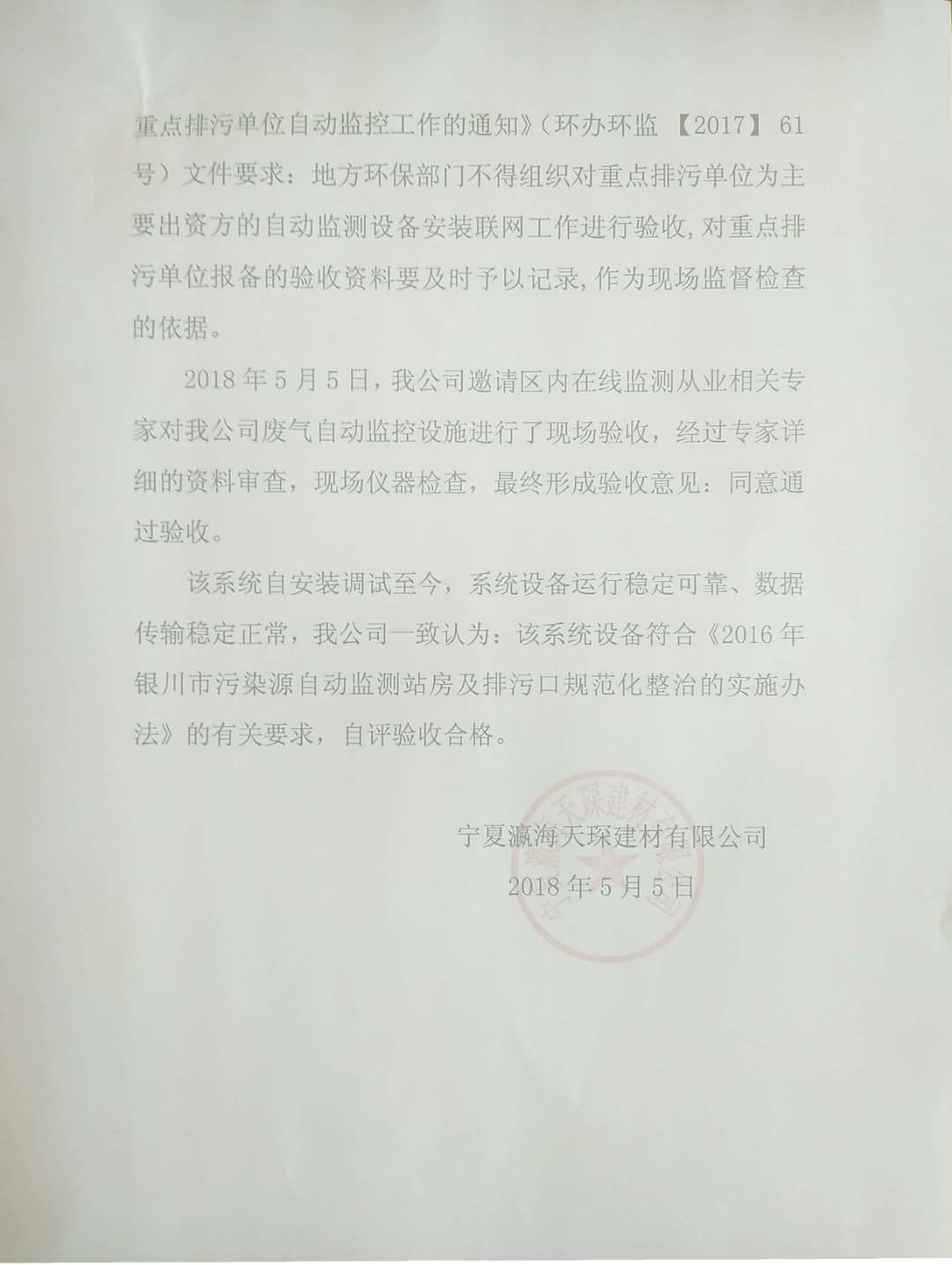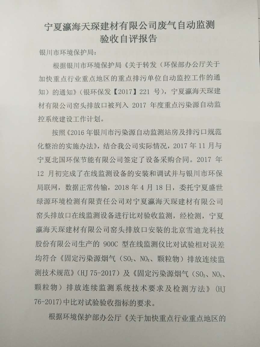 寧夏瀛海天琛建材有限公司廢氣自動監(jiān)測驗收自評報告